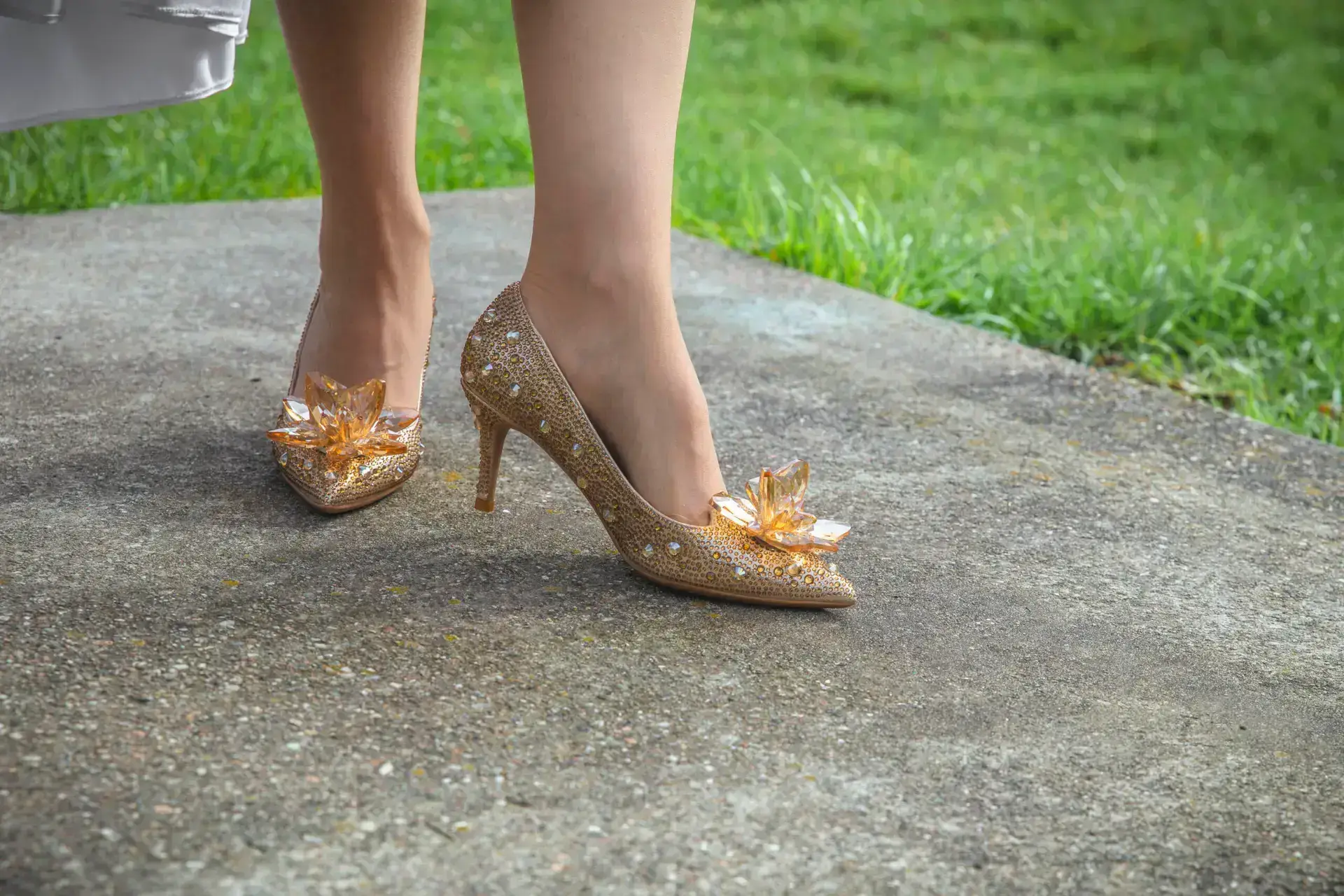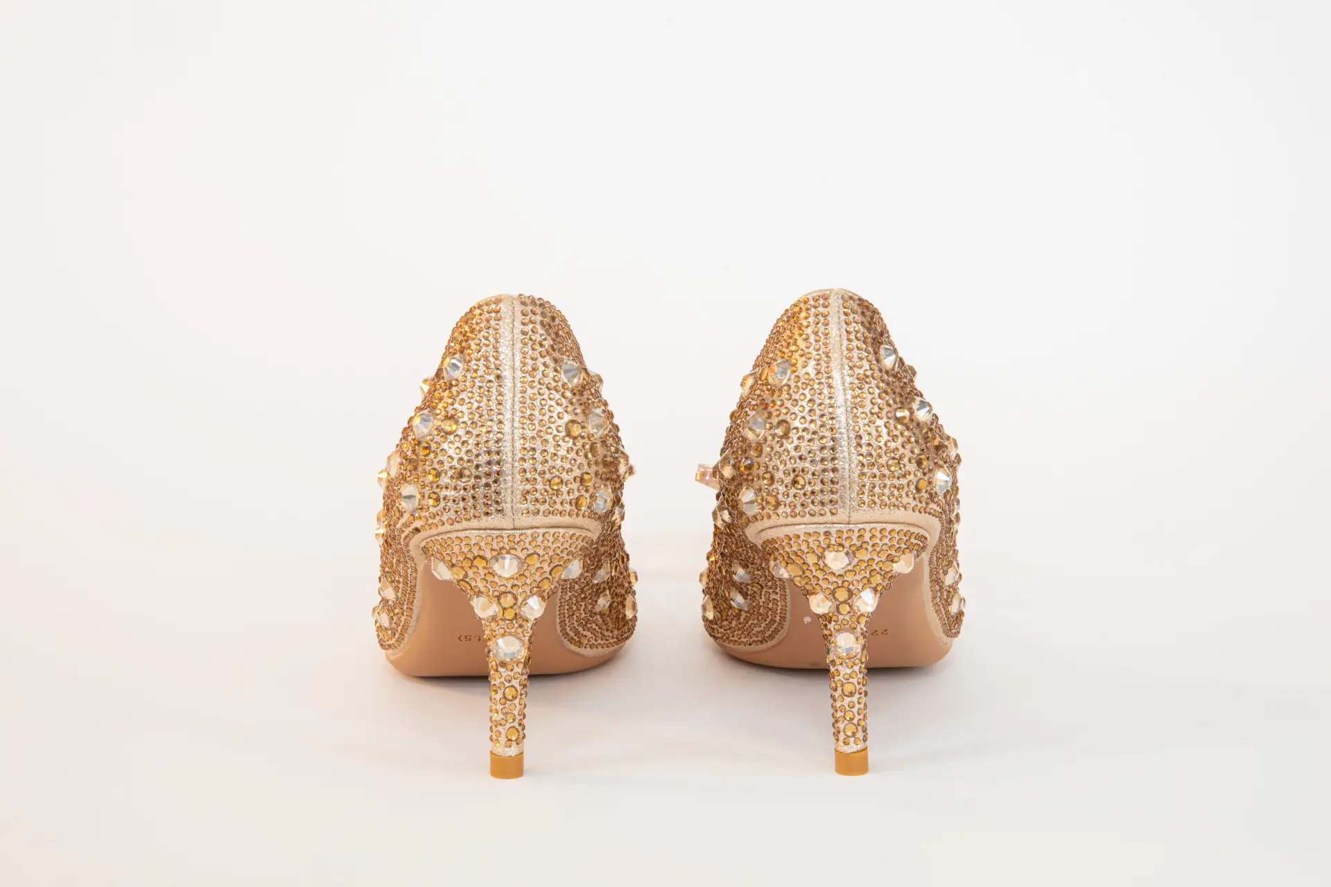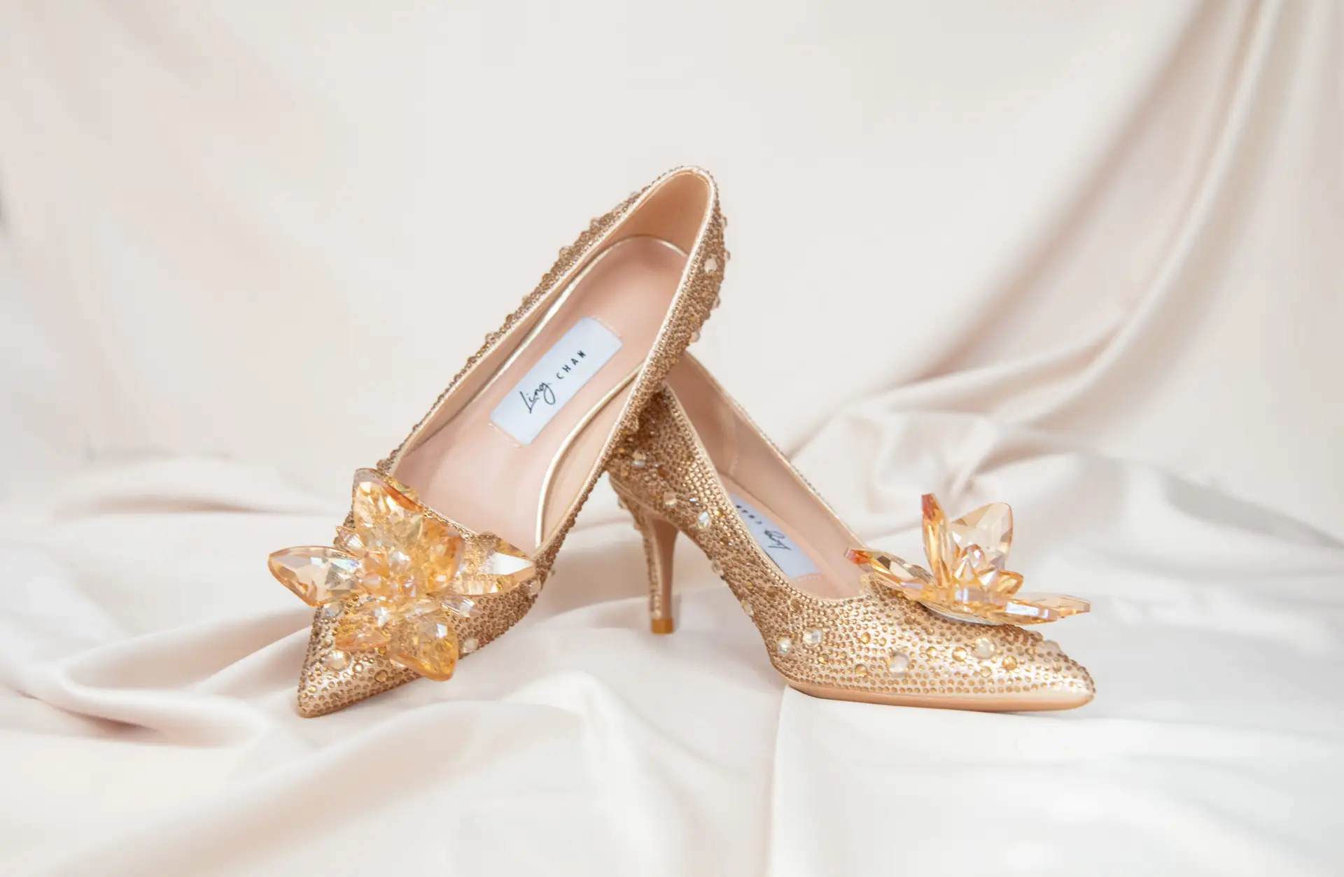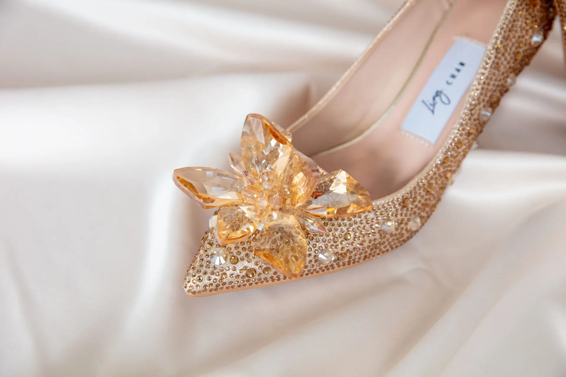 The Alice Crystal—a dazzling masterpiece from Ling Chan that brings a touch of fairy tale magic to your special day. Crafted with meticulous attention to detail, these high heels are adorned with shimmering crystals that catch the light at every angle, creating an enchanting sparkle. The standout feature is the delicate, hand-crafted gold crystal floral embellishment on the toe, adding a unique and elegant touch to your bridal ensemble.