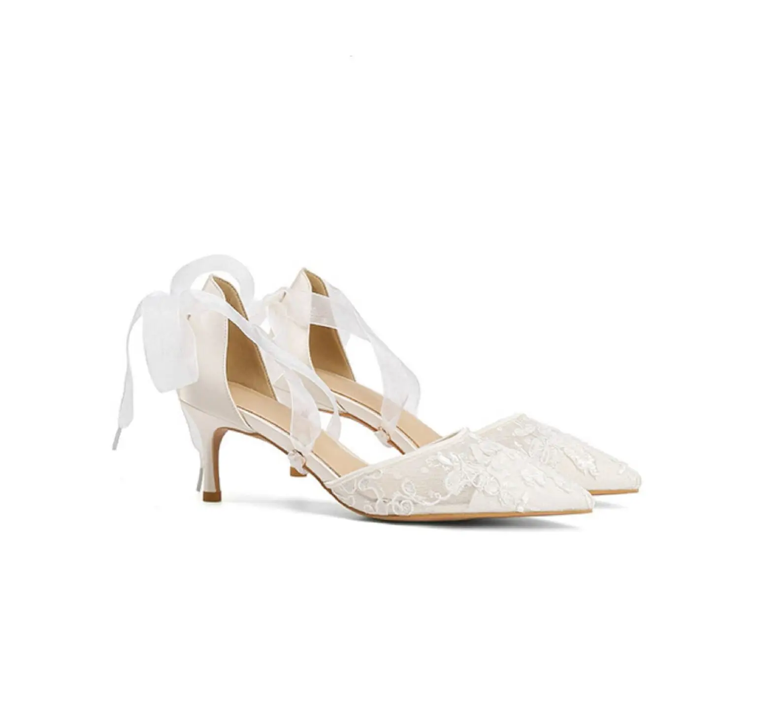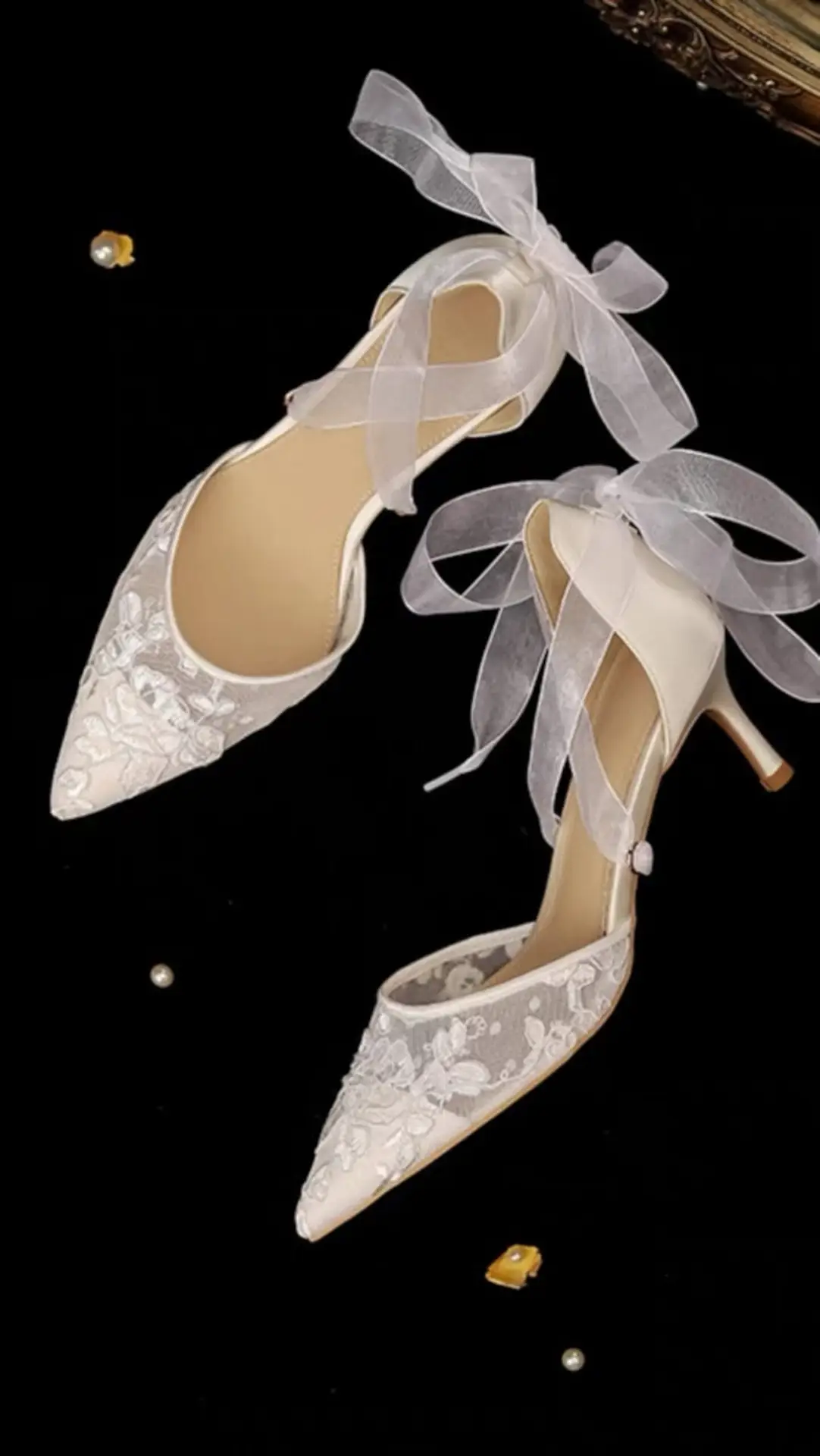 The Chloe is a White Crochet Lace Pointy Toe Heels adorned with delicate Silk Ribbon, these lace wedding shoes are more than just footwear, they’re a statement of grace and sophistication, perfect for your special day.