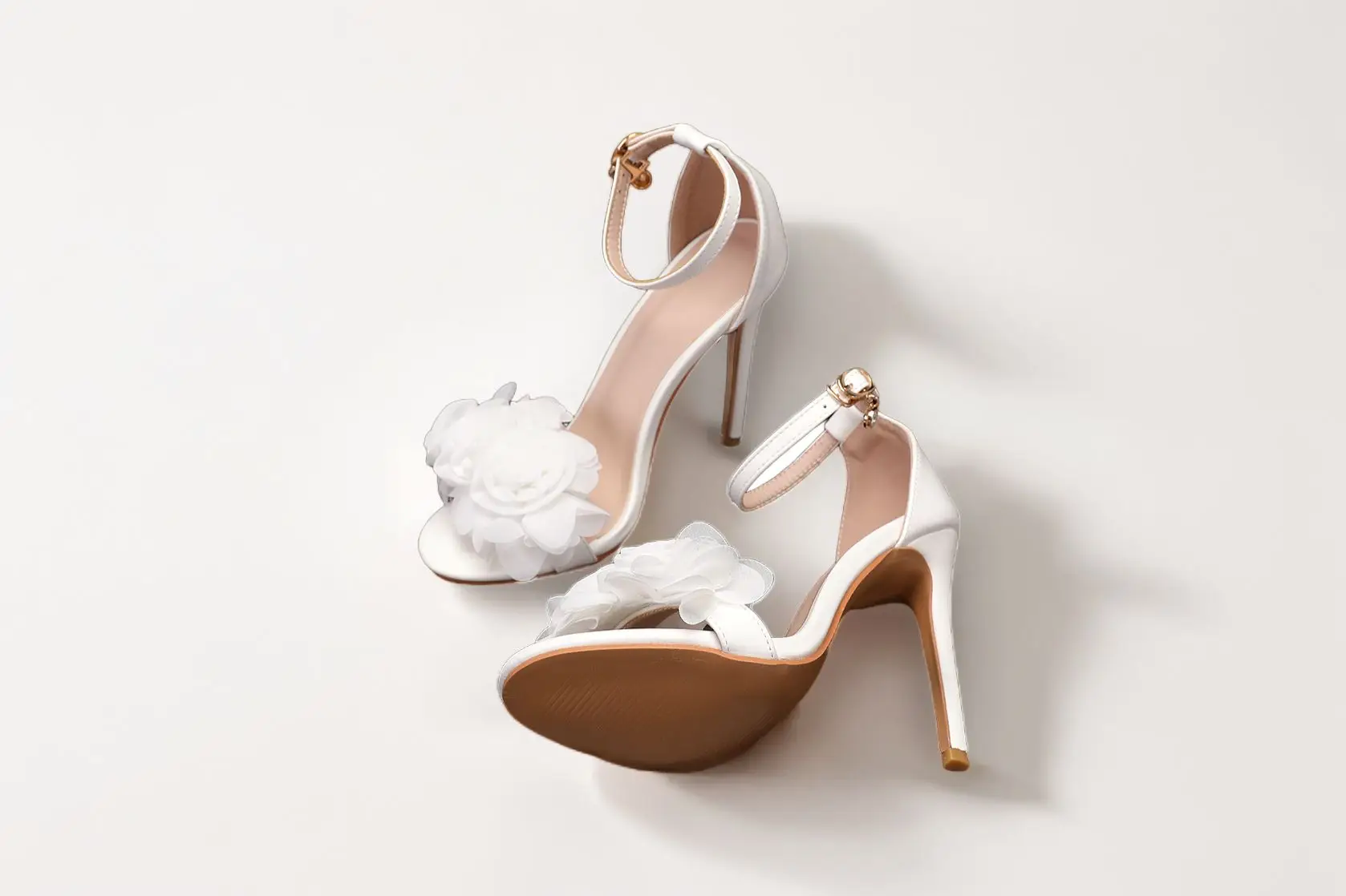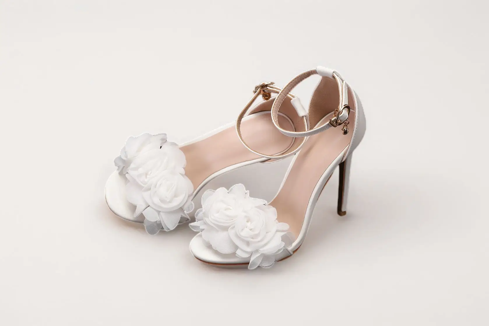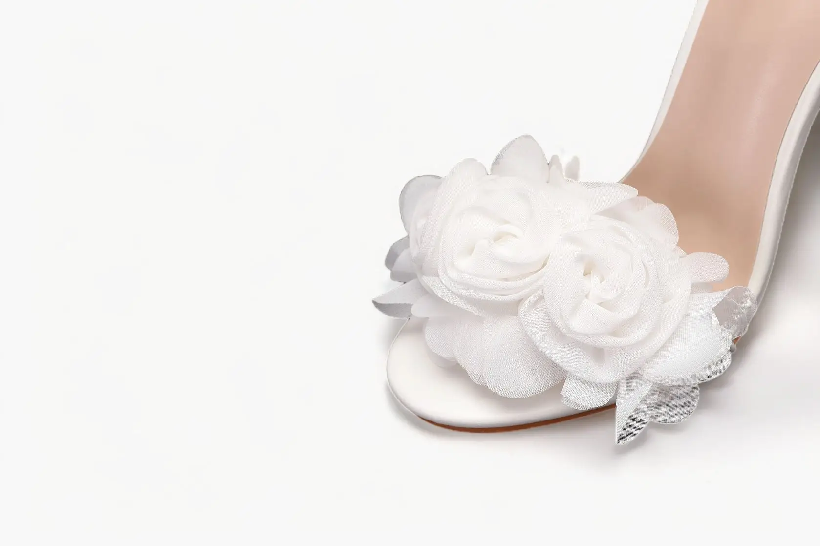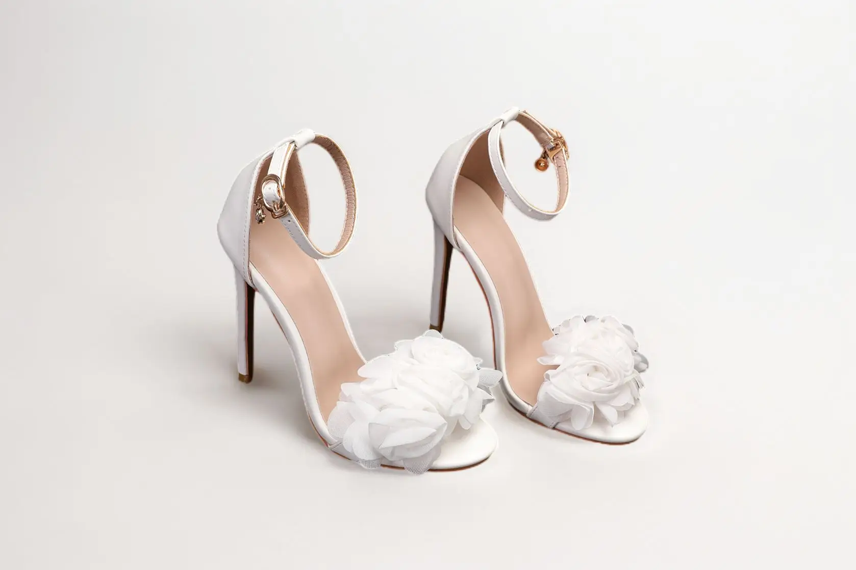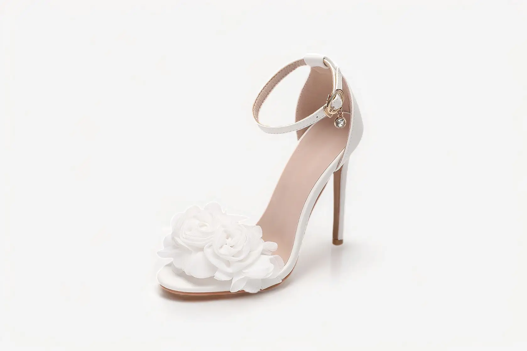 The floral accents on the open toe add a whimsical charm, making these shoes not just a footwear choice, but a statement piece for your special day. The ankle strap, adorned with a subtle yet sparkling jewel, ensures a secure and comfortable fit, allowing you to dance the night away without a worry.